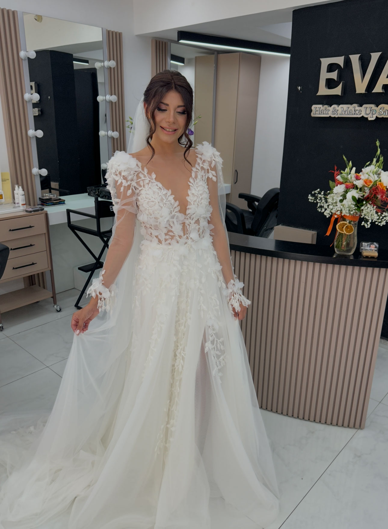 Ayrıca düğün günü stresini en aza indirmek için tüm süreci planlı ve profesyonel bir şekilde yönetiyoruz. Zamanlama, prova notları ve konsept detayları önceden belirlenerek hazırlık aşamasında kusursuz bir akış sağlanır. İsteğe bağlı olarak nedime ve aile makyajı hizmetleri de sunarak bütünsel bir hazırlık deneyimi oluşturuyoruz. EVA Kuaför olarak amacımız, aynaya baktığınızda hayal ettiğiniz gelini görmek ve bu özel anı unutulmaz kılmaktır. 💍✨
